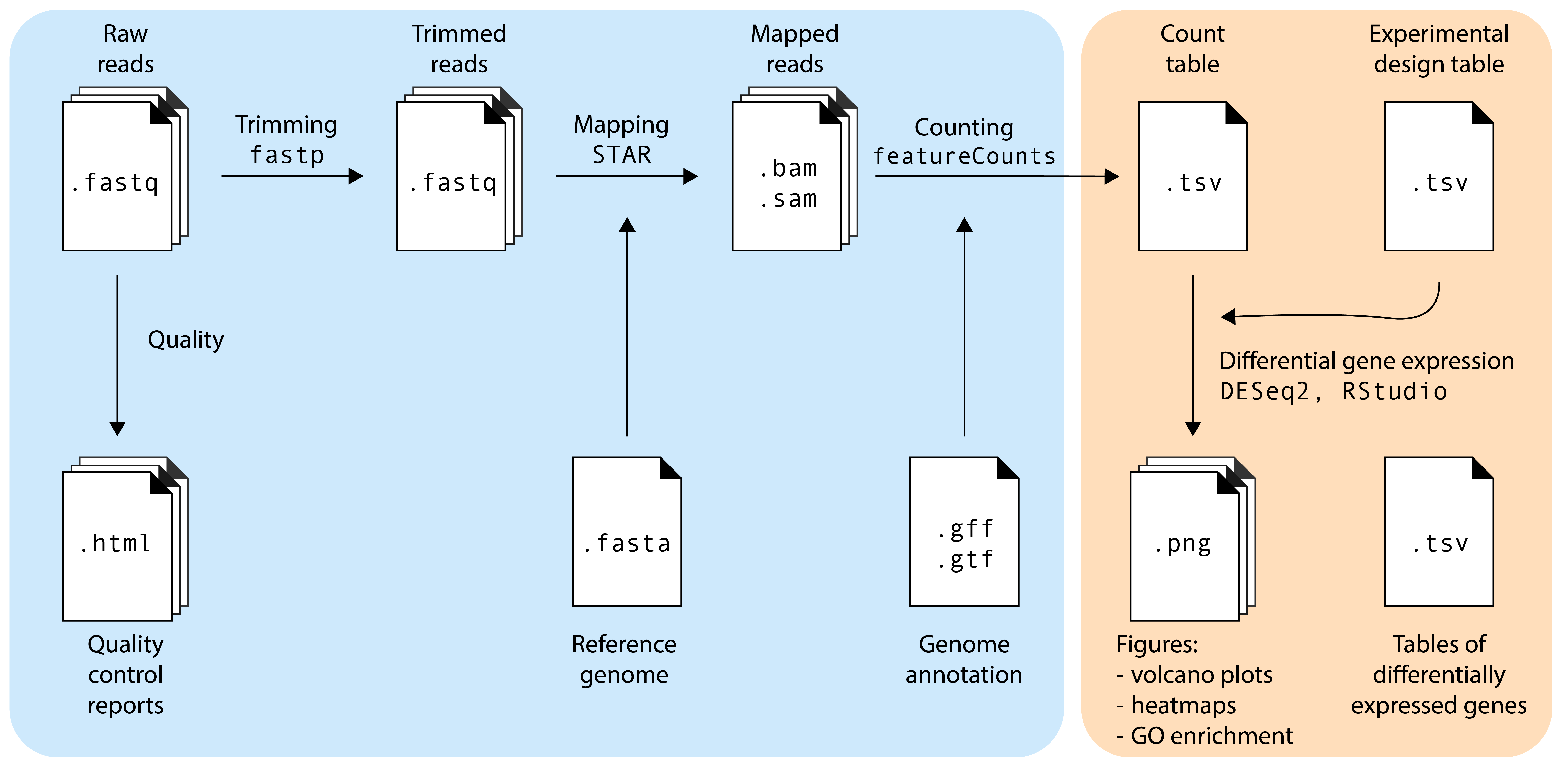 Welcome to the RNA-seq workshop of the bioDSC. This workshop will introduce you to the basics of gene expression analysis using RNA-Seq. It is going to be fun and empowering! You will discover how the total RNA pool of an organism is converted to short sequences called “reads” that can in turn be used to get insights into gene expression. Through careful experimental design, this gene expression information can answer research questions and offer biological insights.